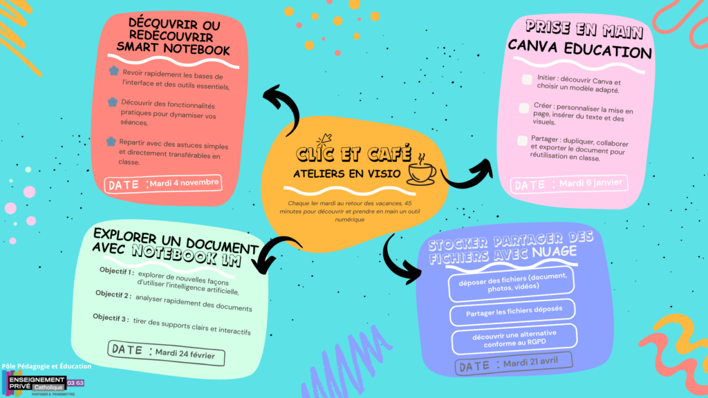 Ces ateliers s’adressent aussi bien aux enseignants du premier comme du second degré et se dérouleront un mardi par période sur la pause méridienne.